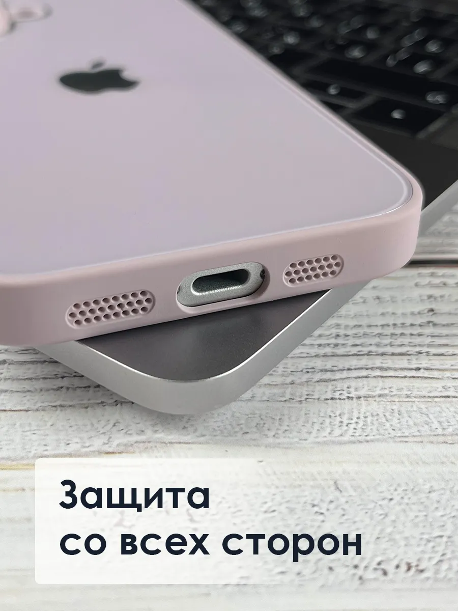 Противоударный чехол для iPhone  с задней панелью из тонкого глянцевого закаленного стекла защитит ваш смартфон от механических повреждений и станет самым любимым Вашим аксессуаром. Основа этого чехла выполнена из прочного TPU-пластика с добавлением силикона на бортиках для более комфортного надевания и изъятия. За счет стекла на задней панели, и относительно небольших габаритов и небольшого веса (всего 30 г), ваш Айфон  будет выглядеть как будто без чехла. Задняя панель не скользит, а благодаря качественным материалам смартфон очень удобно и безопасно держать в руке. Блок камеры на чехле выполнен довольно массивно, выступая за плоскость телефона на 2 мм, и хорошо защищает камеры и вспышку от внешних повреждений, а также попадания лишней влаги и пыли. Блок камеры опоясывает тонкая серебристая окантовка, красиво переливающаяся на свету. С передней стороны бортики чехла выступают на 1 мм от плоскости экрана смартфона, тем самым максимально защищают его при падениях. Чехол накладка плотно прилегает к телефону со всех сторон, не болтается, граница примыкания силиконовых бортов к дисплею не имеет лишних щелей, куда могла бы попасть влага или пыль. Кнопки громкости и кнопка включения телефона нажимаются плавно, мягко и срабатывают моментально. Все технологические вырезы этого бампера имеют 100% точность. Чехол полностью перекрывает оригинальный цвет телефона, поэтому менять внешний вид вашего устройства станет легко, просто сменив цвет стеклянного чехла. Защитный силиконовый кейс на iPhone 16 отлично защищает телефон при ударах и падениях, сохраняя корпус телефона в идеальном состоянии долгое время. Однако при сильном изгибе, как и любое другое стекло, задняя панель может треснуть. Следует помнить об этом надевая и снимая чехол с устройства.
