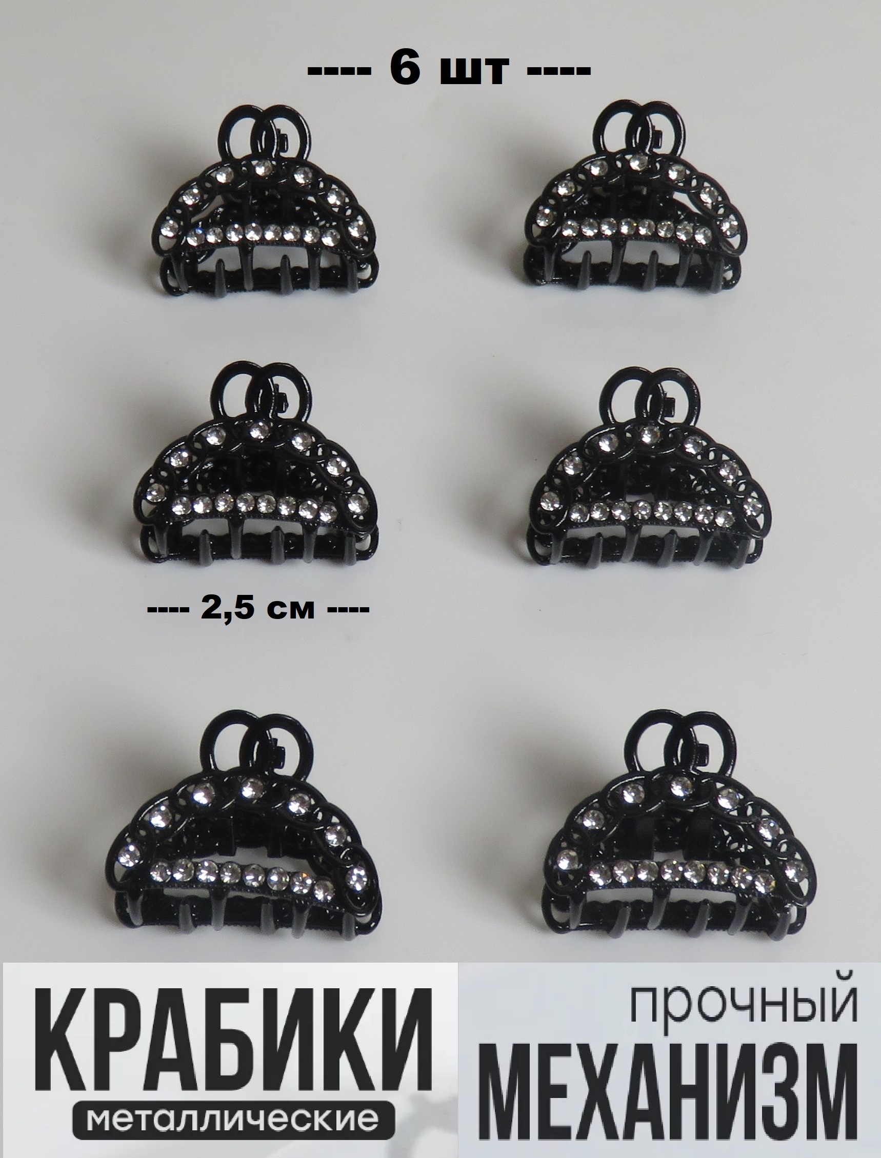 Крабики для волос маленькие набор 6 шт подарок на 8 марта черный с серебристыми камушками