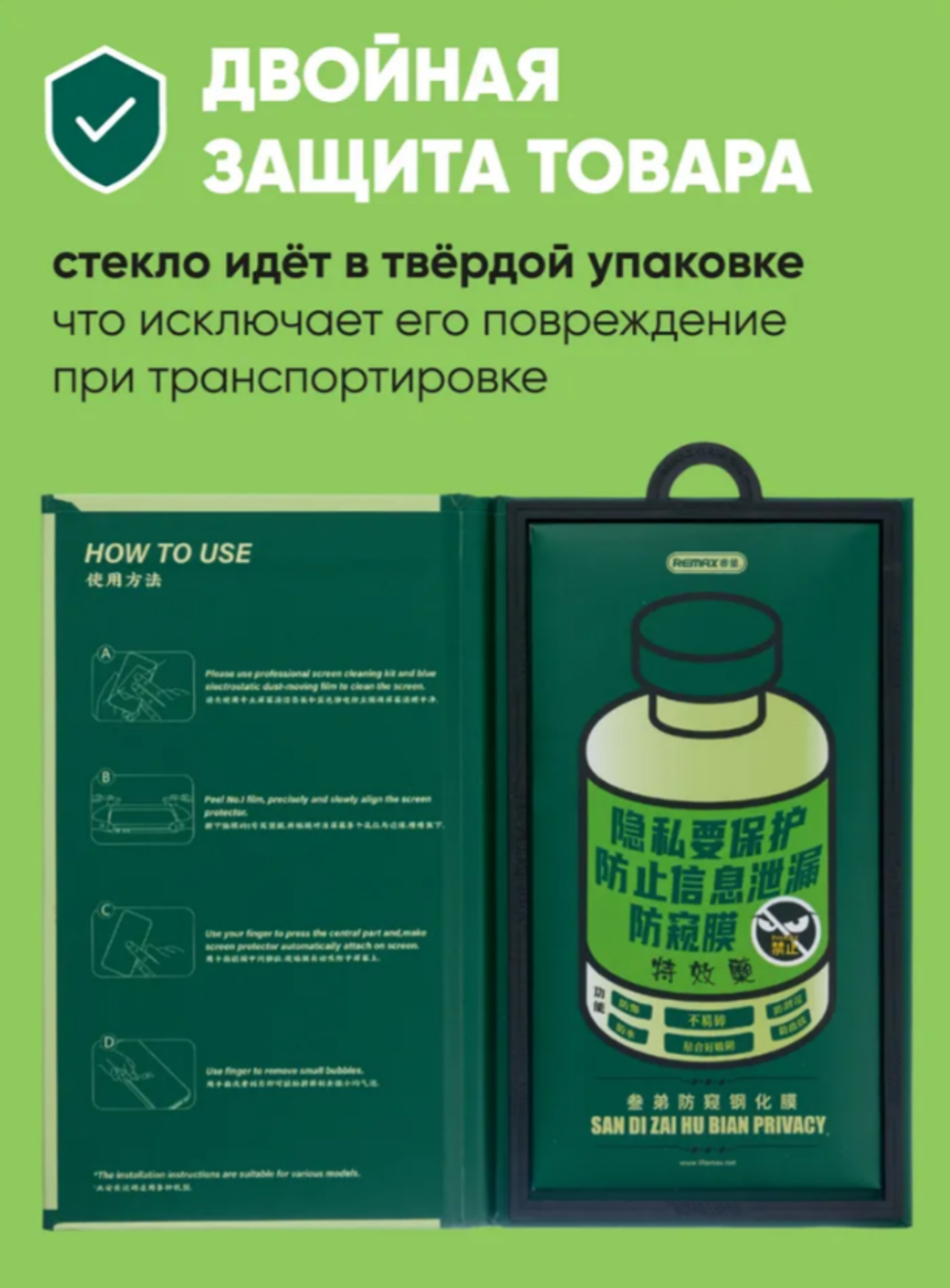 Защитное стекло антишпион для Apple iPhone и Samsung всех моделей от Remax – скроет Вашу личную информацию от посторонних глаз и обеспечит максимальную защиту экрана смартфона! Полноэкранное прозрачное 3D стекло имеет небольшие изгибы по краям и качественное олеофобное покрытие, что дает максимально приятные тактильные ощущения при использовании смартфона. Антибликовое покрытие позволит комфортно пользоваться гаджетом даже при самом ярком солнце. Стекло анти шпион не влияет на работу сенсорного дисплея и ложится на поверхность, не образуя пузырьков. Стекло закрывает ровную поверхность дисплея, клеевой слой нанесен равномерно, а все вырезы под камеру и датчики продуманы. Защитное затемняющее стекло anti spy адаптировано под любые чехлы и бамперы. Высокое качество средства и прочность материалов позволяют защитить экран и камеру не только от царапин и трещин, но и при падении, ударах о твердые поверхности с небольшой высоты. Закаленное противоударное стекло Remax не матовое. В отличие от пленки, защитка имеет прочность 9H, очень прочное и тонкое (толщина составляет 0.3 мм). По периметру аксессуара есть объемная черная рамка, не уменьшающая размер родного экрана. Покрытие глянцевое. Бронь поверхность хорошо откликается на прикосновения. Технология нанесения клея по всей поверхности позволяет установить износостойкое бронированное стекло самостоятельно в домашних условиях. Не нужно быть профессионалом по наклейке гибкого стекла для мобильных телефонов, потому что в комплекте есть всё необходимое для быстрой и удобной установки. Изделие поставляется в плотной упаковке, что исключает повреждения во время транспортировки. В комплект входит: защитное бронестекло на жесткой подложке, тряпочка из микрофибры: влажная салфетка для стекол, а также стикеры (наклейка) для удаления пыли. Противоударное оригинальное защитное стекло антишпион Remax GL-27 - качество, проверенное временем! В линейке представлены защитные стекла, включая антишпионские ( анти шпион) стекла.
