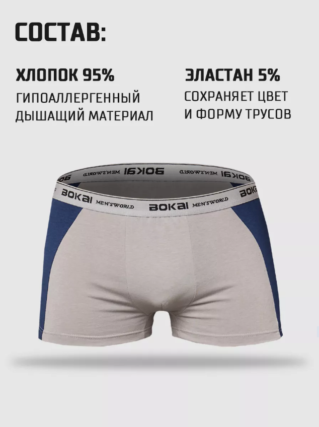 BOKAI — это азиатский бренд мужского и детского нижнего белья, предлагающий доступное по цене, комфортное и практичное белье, выполненное из качественных смесовых тканей (хлопок с эластаном), с хорошим кроем, антибактериальными свойствами, обеспечивающее удобство и свободу движений для активных мужчин. Бренд фокусируется на сочетании качества и доступности, делая свои изделия подходящими для повседневной носки.